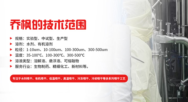 上海喬楓實(shí)業(yè)有限公司,成立于2012年,是從事噴霧干燥設(shè)備的研發(fā)設(shè)計(jì)、生產(chǎn)、銷售(小型噴霧干燥機(jī),實(shí)驗(yàn)型噴霧干燥機(jī),35℃低溫噴霧干燥機(jī),有機(jī)溶劑噴霧干燥機(jī),低溫閉式循環(huán)噴霧干燥機(jī)、超細(xì)粉末噴霧干燥機(jī)、噴霧冷凍干燥機(jī)、真空噴霧干燥機(jī)、氣流噴霧干燥機(jī),噴霧造粒干燥機(jī),離心噴霧干燥機(jī),沸騰制粒機(jī)等)和售后于一體的綜合性公司,本公司現(xiàn)成為一家致力于為生物制藥、精細(xì)化工、新能源、陶瓷造粒及食品工程等領(lǐng)域提供全套解決方案的整線交鑰匙工程企業(yè)。